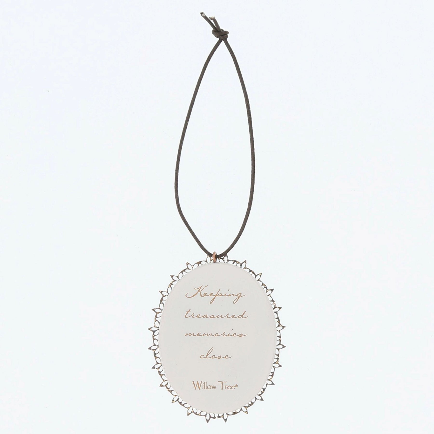 Une suspension avec une petite plaque joliement décorée, avec la représentation d'une fille tenant du romarin gravée en son centre. Chaque figurine Willow Tree, créée par Susan Lordi, est en résine et peinte à la main, fournie dans une boîte cadeau. Ces figurines ne sont pas des jouets pour enfants. Destinées aux adultes uniquement.